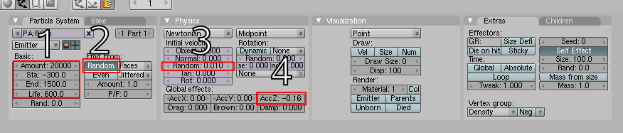 - Amount determines the number of particles that are to be produced. I’d recommend using less than 10,000 if you’re having performance problems. Sta determines the frame where the particles start to be emitted , in this case we put it at -300 so when we start rendering from frame 0 we will already have many particles in various positions. End determines which frame to stop emitting particles. Life determines the life span of each particle in terms of frames.